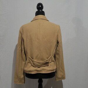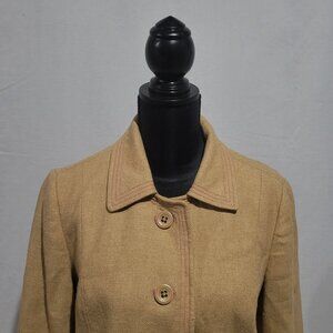 Gap cropped jacket. Light brown with pink stitching. It is marked a size large. The exterior is 90% wool and 10% nylon. The body lining is 100% cotton. The sleeve linings are 100% acetate. 4 brown plastic buttons on the front. 2 waist pockets. It is a little fuzzy in spots, shown in the photos. Minimal wear from normal use. There are not any stains, tears, or holes. Very good, gently used condition.