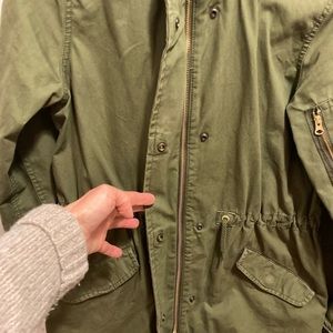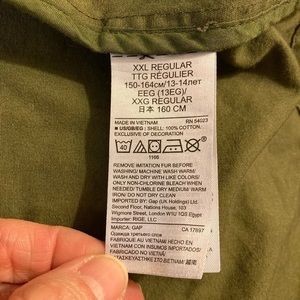 Gap kids size XXL regular. Army green colour. Made in Vietnam. 100% cotton. Like new. Hood. Zip and button closure. Draw string waist. 2 pockets at front. Small zip pocket on sleeve.