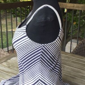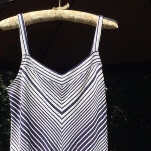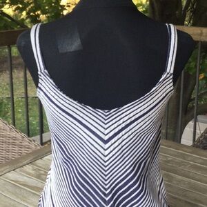 Chevron pattern summer sundress in navy/off white. Excellent condition. Size S. Dress slips on over head - no buttons, zippers or lining. Easy summer comfort!