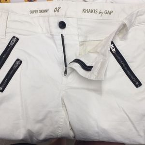 Gap white khaki super skinny pants 97% Cotten. Black zipper pockets on front and snap back pockets. Angles stitching on back calf of pants for more detailing. In greats condition! No stains or wearing basically new! These are the best summer whit pant!