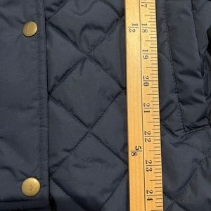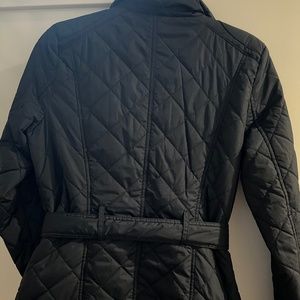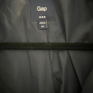 Gap women size small, navy quilted and belted jacket. Gold snaps down front and two chest pockets. Two pockets at sides as well. Good used condition.