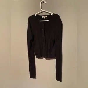 Ribbed knit cardigan with a round neckline. Button-front closure. Long sleeves and slim fit. Versatile piece for layering.