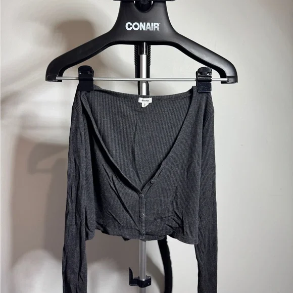 Stylish black ribbed cardigan. Features button-up front. Long sleeves for added warmth.
