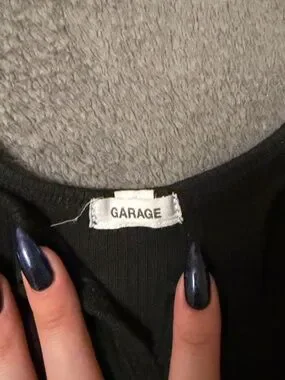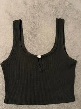 Sleek black ribbed tank with scoop neckline. Stretchy fitted silhouette. Versatile everyday layering piece.