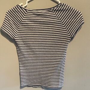 Stretchy tee with black and white stripes. Perfect for casual wear. Faint stain front left took close up pic.