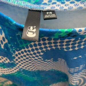 Lightly used, Garage bright white with blue and green optical art in a size womens small. The t- shirt is soft and stretchy with a bright pattern.