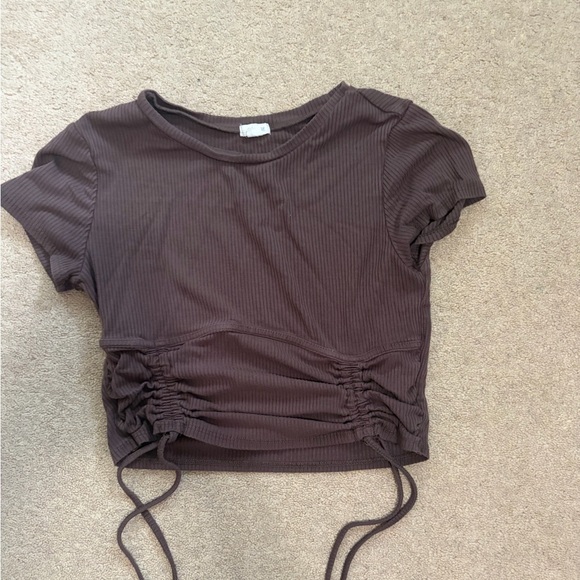 Fitted ribbed crop top with short sleeves. Front drawstring ruching for adjustable length. Scoop neckline for a flattering fit. Stretch fabric for everyday wear.