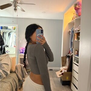 Stylish charcoal ribbed crop top with button-up front. Ideal for casual wear.