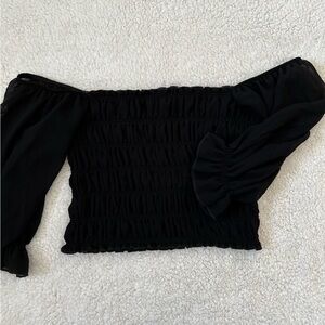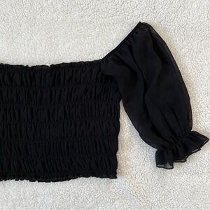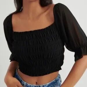 100% Polychiffon Hand-wash, cold Smocked bodice Puff sleeve with elastic cuff Crop length (hits above the belly button)