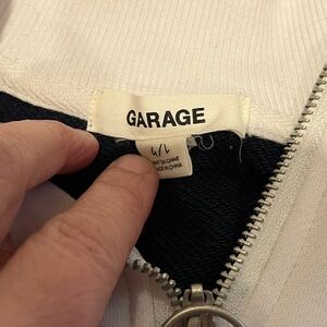 Trendy cropped sweatshirt by Garage featuring a bold colorblock design: white upper, navy blue body, and red sleeves. Half-zip closure with ring pull and ribbed stand collar. Made from a soft blend of cotton and polyester. Size: G/L (Large).