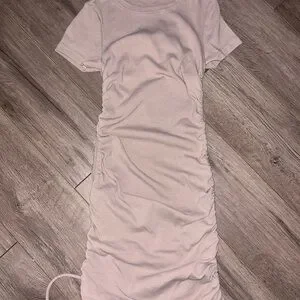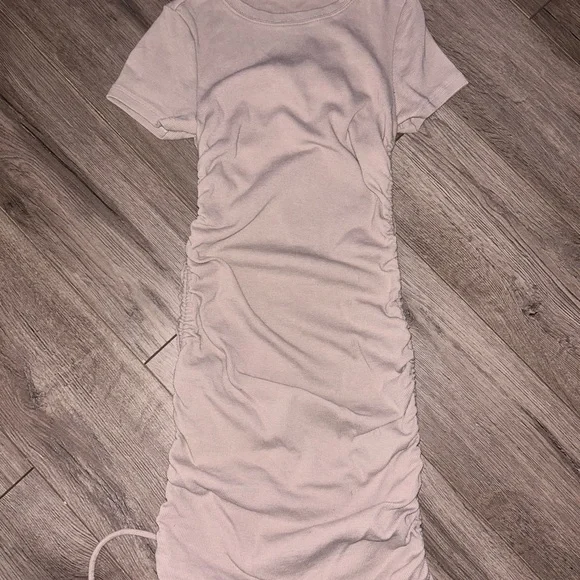Chic cream mini dress with ruched sides. Soft and stylish. Perfect for any outing.