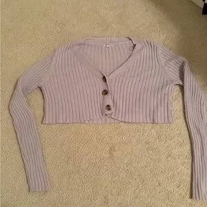 Soft cropped cardigan in a pale lavender rib knit. Features V-neck and three tortoiseshell-look buttons. Lightweight and versatile for layering.