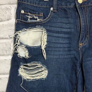 Stylish distressed denim shorts with frayed edges. Features a classic blue color.