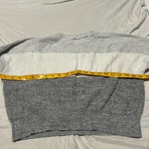 This stylish sweater from Garage features a bold color-blocked design with a light cream upper and a heather gray lower section. Crafted from a soft knit material, it offers a cozy feel and a classic crew neck style. Perfect for adding a touch of elegance to your wardrobe.