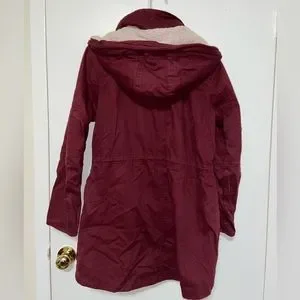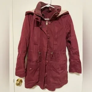 Burgundy jacket from Garage. Not sure of the size there is no tags. I believe it is a medium. Fur hood.