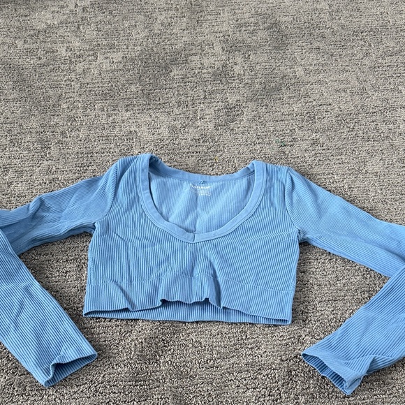 Stylish light blue ribbed crop top with long sleeves. Perfect for casual wear.