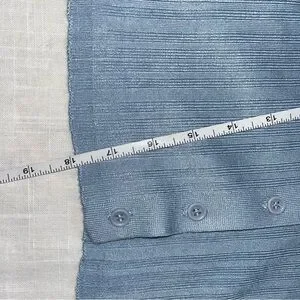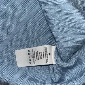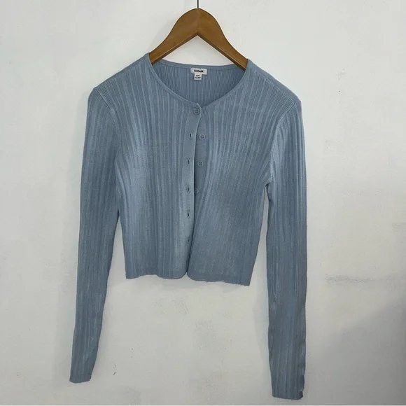 Chic light blue ribbed knit top. Features button-up design. Ideal for casual wear.