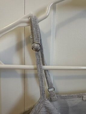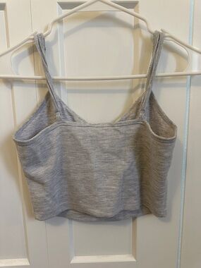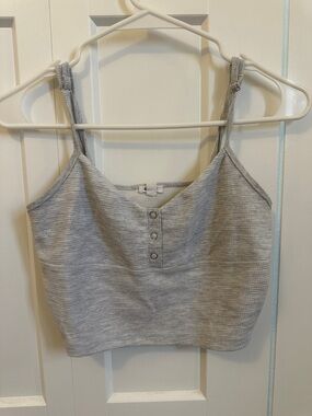 Light gray ribbed cropped cami by Garage. Thin adjustable straps. Snap-button detail at center front. Soft, stretchy knit fabric.