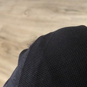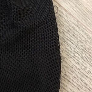 Black top with mesh panels. Super soft material and stretchy mesh. Lots of little string coming out at the mesh (elastic thread) and idk what it’s from. Can be trimmed away without affecting the top. Nothing broken. Minor unnoticeable pilling throughout.