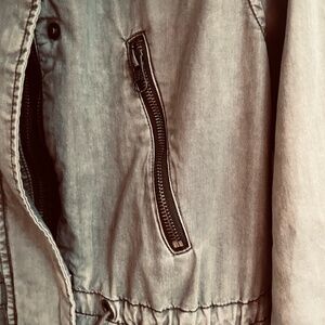Explore the utilitarian aesthetic with the Garage Military Smart Parka, a versatile grey green jacket that seamlessly blends functionality with style. Designed for women who appreciate a rugged casual look, this slim-fit parka features an adjustable waist with a cinch cord, a sleek denim cotton blend outer shell, and a comfortable cotton blend lining. The jacket's mid-length cut, coupled with its long sleeves and fishtail hem, provides ample coverage and warmth, making it ideal for the transitional layers of fall, spring, and summer.