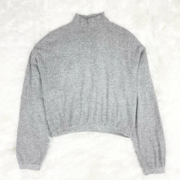 Cute and super soft mock neck sweater by Garage. The fabric is ribbed and the cut is slightly cropped with an elastic waistband to create a faux tucked look. Excellent condition, size small.