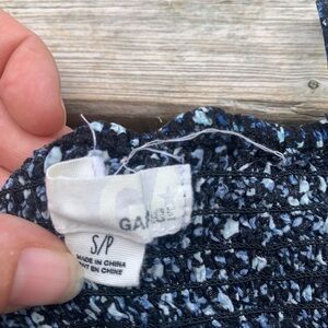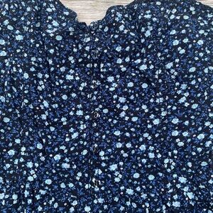 Super cute and comfy floral mini dress from Garage, size Small. Features a navy blue base with tiny light blue and white floral print, stretchy smocked bodice, adjustable spaghetti straps, and decorative button front detail.