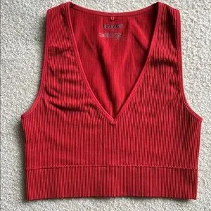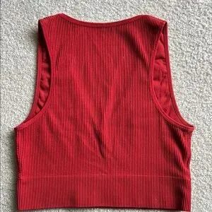 Garage, Red Ribbed Crop Tank Top features a vibrant red hue and a ribbed knit texture, offering a sleek and minimalist style. With its sleeveless design and cropped length, this top is ideal for casual or athletic wear, providing a comfortable and form-fitting silhouette.