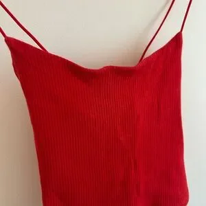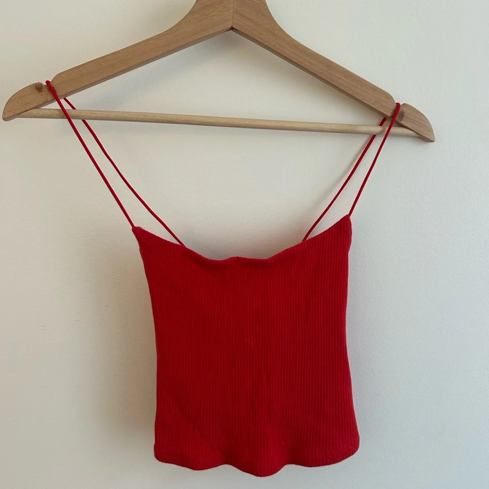 Sleek ribbed camisole with delicate double spaghetti straps. Soft, stretchy knit hugs the silhouette. Vibrant red color for a bold daytime or evening look. Easy to style with high-waist bottoms or layered pieces.