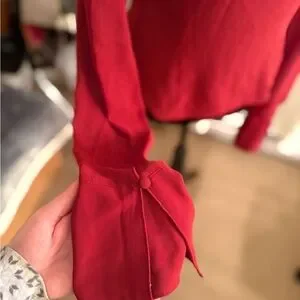Deep red blouse with ruffle details. Features a stylish tie-front design.
