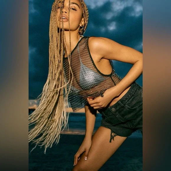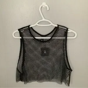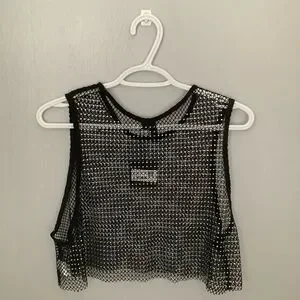 Turn heads with this stunning rhinestone mesh cropped tank from Garage! Featuring a black fishnet design adorned with shimmering rhinestones, this top adds instant sparkle to any outfit. Perfect for layering over a bralette, bikini, or bodysuit for concerts, festivals, or nights out.
