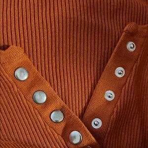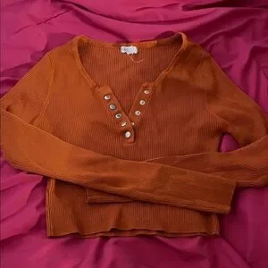 Stylish rust blouse with ribbed texture. Features a button-up front. Perfect for versatile styling.