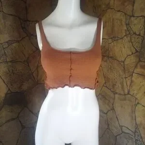 Stylish ribbed tank with a square neckline. Features a cropped fit and ruffled hem.
