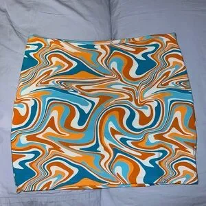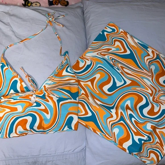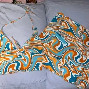 The top is a small and the mini skirt is a medium.