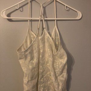 Sheer lace flowy tank with floral pattern. Straps are adjustable