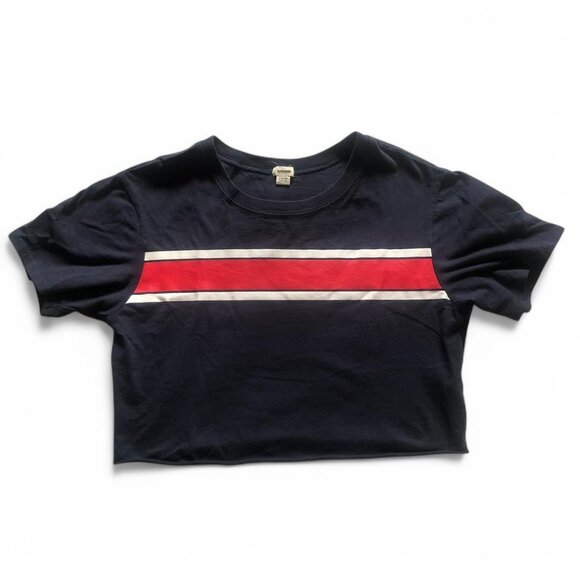 •old school 2010s GARAGE navy blue red white striped stripes graphic raw hem cropped crop top preppy tee t-shirt