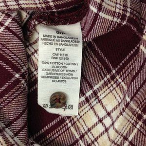 Garage Tunic Fit Button Up Shirt Women's Size Small Burgundy Beige Plaid