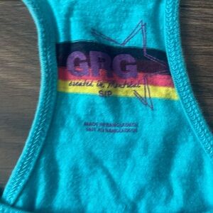 Lightweight racerback tank by Garage. Turquoise base with multi-color horizontal stripes. Soft casual style. Easy to layer or wear alone.