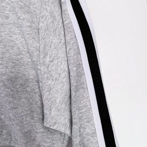 A grey cropped crewneck with a black and white stripe on both sleeves. Makes for any cute and comfy outfit!