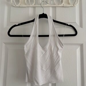 Elevate your style with this chic white ribbed halter top. Perfect for any occasion, this top offers both comfort and elegance.
