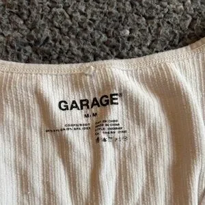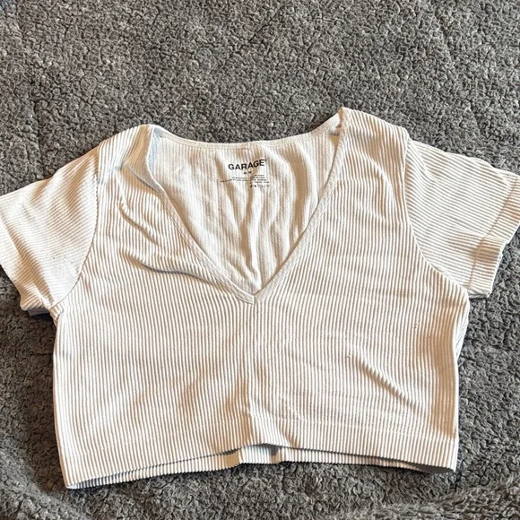 White ribbed V-neck crop top by Garage. Soft stretch fabric for a comfortable, flattering fit. Short sleeves and subtle ribbed texture for everyday style. Easy to pair with jeans or skirts.