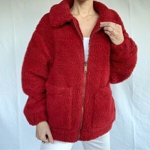 Soft, cozy and warm teddy jacket. Amazing dark red color. Fully zipped, flat 2 pockets at the front. Amazing used condition very few signs of use, no flaws. Perfect for fall or winter, very easy to style.