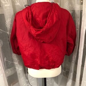 Vibrant red windbreaker hoodie with striped sleeves, cinched waist and upper neck area. Jacket has full frontal zip with long sleeves. 100% polyester. Please reach out for measurements.