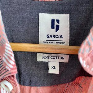 Garcia button down abstract tropical floral print shirt in salmon pink with sage, black, white, and rust accent colours. Size XL, great used condition. Chest measures 22 inches laying flat, length at front is 30 inches, at back is 32 inches. Cat friendly, nonsmoking home.