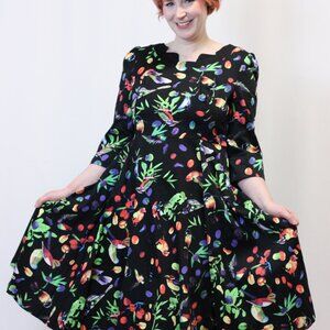 Fly up, up, and away in this Garden Birds Tea Dress! This is a vintage-style number for all the avian-minded girls! Soar to new heights of pinup fashion in this long-sleeved dress, made out of a soft, stretchy black cotton material. Dress has a scissor cut-out neckline in front, and has beautiful shades of purple, orange, light green, and blue. Friendly birds sit perched atop garden leaves in this beautifully patterned frock. Sleeve length is 3/4, and dress hits just below the knee.