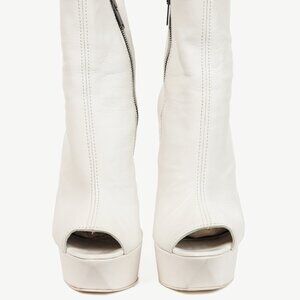 Made in Italy, these ankle boots from Gareth Pugh's 2014 Spring and Summer runway collection are crafted in a soft white leather, and feature angular metal high heels, almond peep toes, inner side zip closures, high platforms, and leather lining and soles.