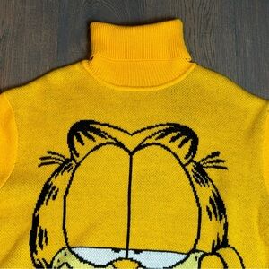 Collab, merch, merchandise, Garfield, Garfield the cat, comic, comics, graphic, novelty, wool blend, heavyweight, streetwear, turtleneck sweater, funny sweater, funny