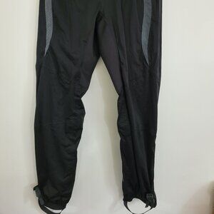Comfortable black athletic pants with stylish gray accents. Lightweight insulation filling along with a brushed mesh layer (doubled at the buttocks) is paired with a thermoregulation layer to retain the perfect amount of heat for cold weather activity and sport. The elastic waistband has belt loops and a zip fly designed with a snap and hook closure for a secure, comfortable fit. Features like ankle zippers and oversized cuffs accommodate a variety of boot shapes and sizes