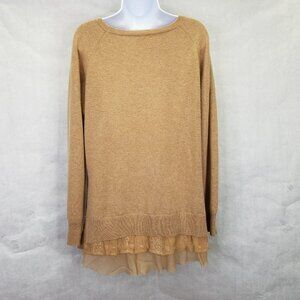 Garnet Hill Shirt Tail Cashmere Sweater Women's L Oatmeal Brown Sheer Lace Hem