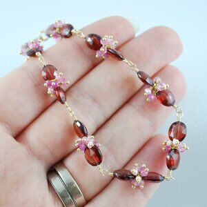 This garnet bracelet would make such a lovely piece for a Valentine's Day bride. Dark red garnets form the body of the bracelet, while tiny pink rubies and freshwater pearls are clustered between. I have used gold-filled components throughout, which really enhances the pink and red tones of this beautiful piece.