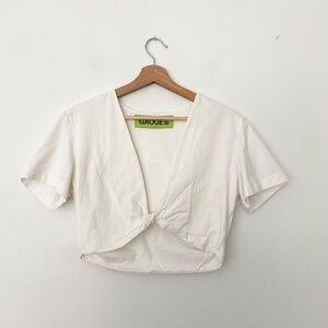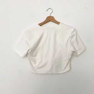 This organic cotton crop top with twist detail features shoulder pads, pluging V-neckline, and short sleeves.